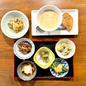 2/17(火)~2/21(土) ・葉ネギの酢味噌かけ ・牛肉とささがき牛蒡のきんぴら ・せりの胡麻和え ・きのこのみぞれおろし ・白菜の野沢菜ちりめんまぶし ・秋刀魚の南蛮漬け ・蕪とシーフードのクリームスープ ・カンパーニュ